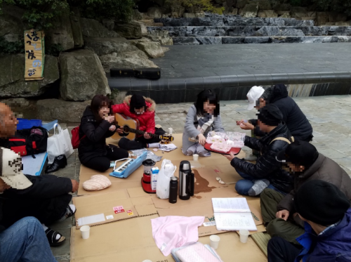 炊き出しにおける心のサポート活動です。コーヒーを飲みながら、みんなで輪になってゲームや歌・お話を楽しみます。